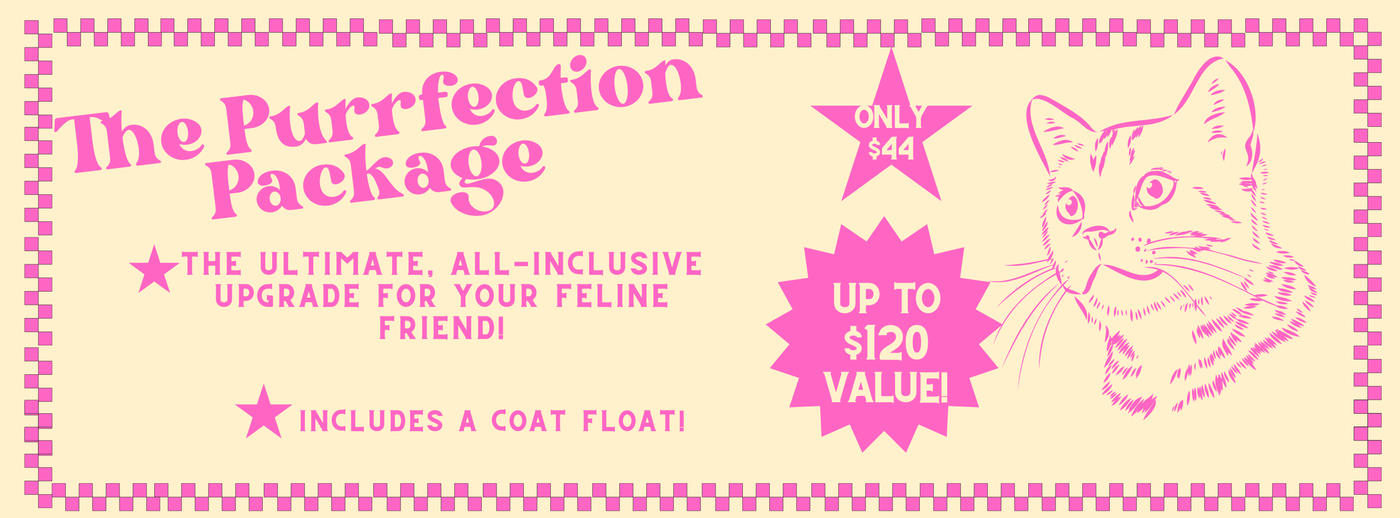 For cats struggling with pore build up or stubborn skin issues, this cleansing treatment provides gentle yet effective relief. It includes a warm exfoliating wash to open the pores, followed by a specialised spray that targets dirt, oil, and sebum while maintaining essential moisture to prevent dryness.